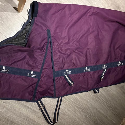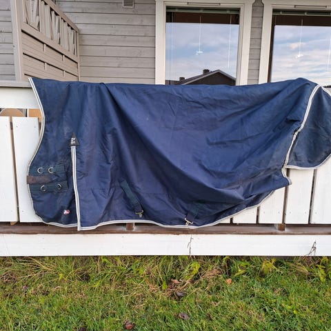 Finntack regndekken i blå farge str 145, halvhøy hals, pent brukt, men litt skittent og blir ikke vasket før salg