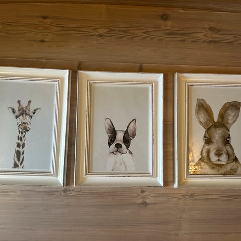Selger to bilder med rammer til barn. Fine å ha på barnerommet med fine farger. Noen usynlige riper på glasset, da det er plexiglass.