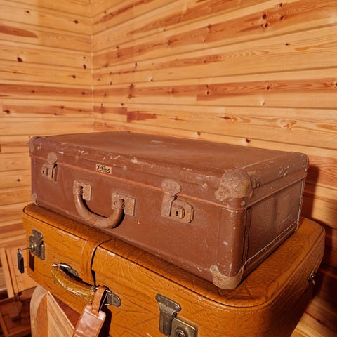 Samling av 4 retro/vintage kofferter. 1 i skinn (76cm x 38cm x 25cm) 1 i lakkert brunt skinn med stropper (80cm x 50cm x 26cm), 1 i metall og tre (58cm x 37cm x 18cm), 1 i metall (77cm x 40cm x 31cm). Alle mål er omtrentlige. Bra for restaurering eller hobbyprosjekter. Alle trenger en eller annen form for reparasjon (se bilder). 500 kr for alle. De kan IKKE sendes