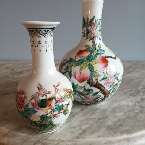 Kinesisk porselensvase med dekorative blomstermotiver og fargerike detaljer. Vasen har tradisjonelle kinesiske mønstre og symboler, og er laget i porselen. Passer til dekorasjon i hjem eller kontor. Ingen bruksmerker. H 17 cm.