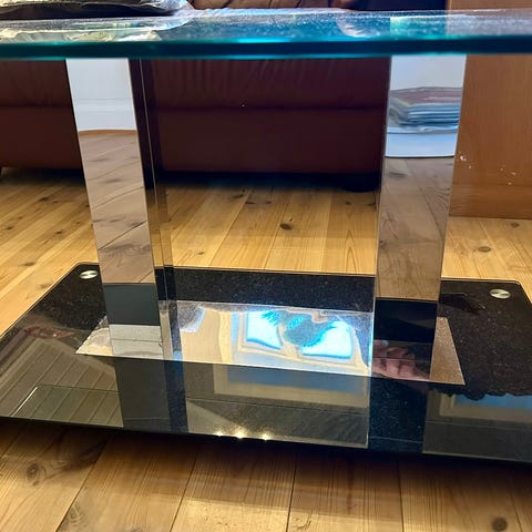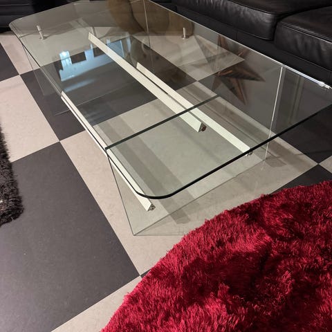 Stort og stilig glassbord med svart hylle under