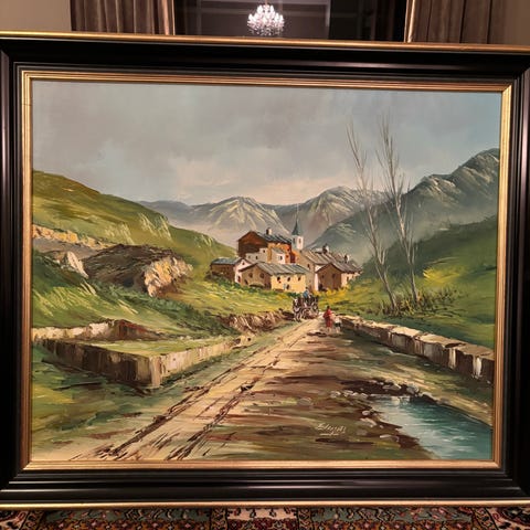 Maleri som viser et landskap med foss, trær og fjell i bakgrunnen. Bildet har en ramme i tre.