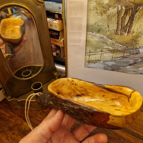 Skålen burde være perfekt til hytter eller turer. Den er lett, også lett å rengjøre. En gren som var på utsiden er hult ut, drn kan kanskje holde en skje. Kanskje kan skålen brukes til en gryterett, eller bare nøtter, bær, el.l.