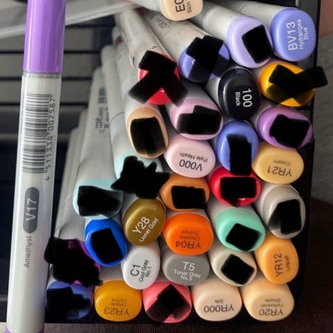 Tusjer, noen vaskbare og 2stk «magiske» tusjer (1 hvit og 1 blå) om du kombinerer de blir de til gul! Brukte men gode: 45kr