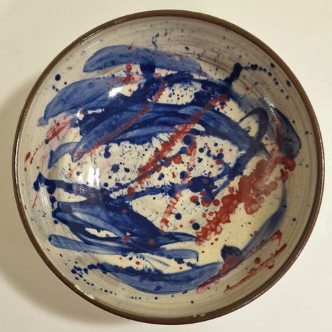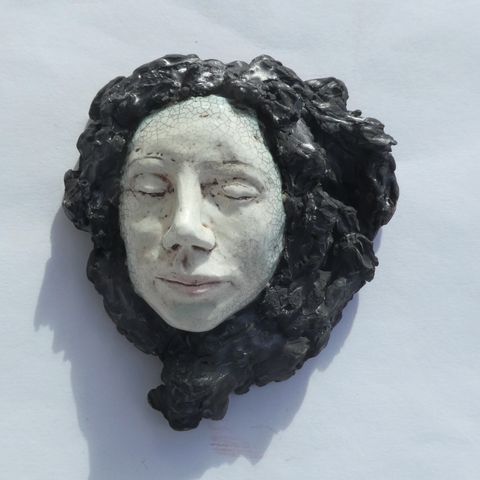 Regal keramikk skål med dekorativt ansiktsmotiv. Skålen har en rund form med en hvit og svart fargekombinasjon, og innsiden er glasert med en grønnlig nyanse. Passer til oppbevaring eller som dekorasjon.