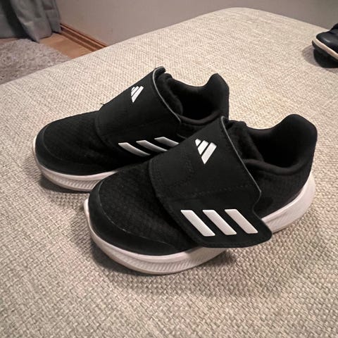 Adidas Baren unisex barnesko i størrelse 34. Skoene har en svart farge med hvite detaljer.