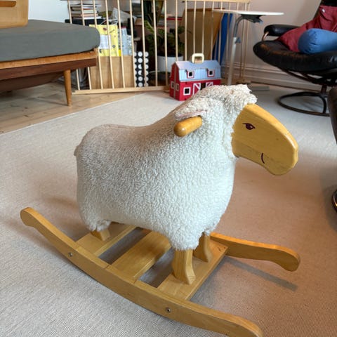 Gyngesau laget av tre og stoff. Produktet har et mykt, grått stoffdeksel på kroppen og hodet, med en naturlig trebase og håndtak. Egnet for barn som leker og utvikler balanse og motoriske ferdigheter.