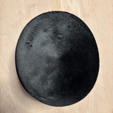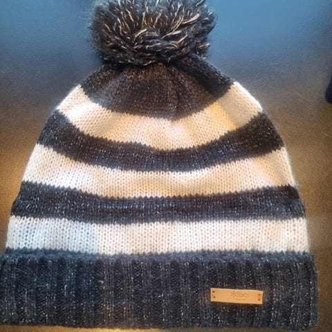 Svart barret, rund kant, myk lue/hatt med flat pull.