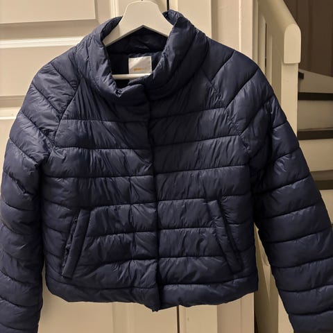 Vattert lettvektsjakke med strikket ermer. Jakken er hvit og har lommer i sidene. Den har rund hals, glidelås foran og bred, ribbet mansjett ved ermeslutten og i nedre kant.