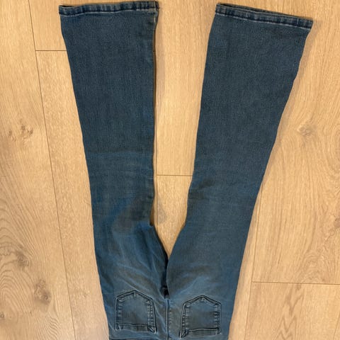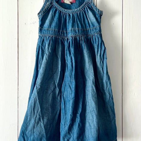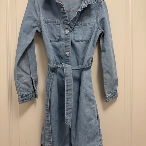 ONLY denimkjole i blå farge, størrelse 128 for jente. Kjolen har lang erm, glidelås foran, og lommer. Laget i denimmateriale. Stramming i livet