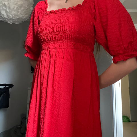 Selger en fin kjole for spesielle anledninger som er brukt én gang. Kjolen har et dypt V-kutt.