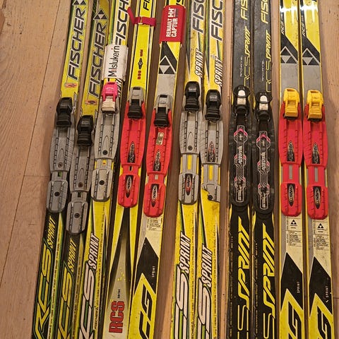 Skiene leveres med monterte bindinger, klare til bruk. Normal bruksslitasje etter alder, men fullt funksjonelle. Sålen er hel og fin, og kantene er i god stand.