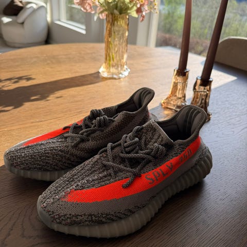 Selcer noen pent brukte Yeezy SPLV-350 joggesko i størrelse 42. Skoene har en fargerik design med grå og oransje detaljer.
