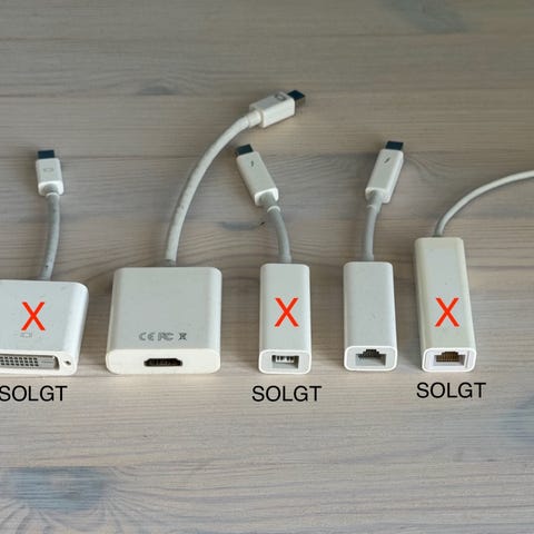 Selger tre ulike Apple-adaptere. Merk at alle har forskjellig plugg inn mot maskinen, så sjekk hva du trenger!