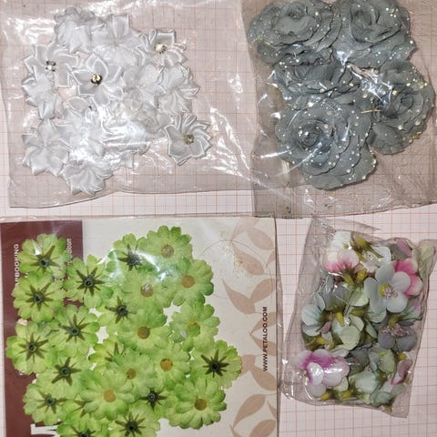 Pakke med ulike dekorative blomster og perler i forskjellige farger og materialer. Passer til hobbyprosjekter, scrapbooking og håndverk. Inneholder både stoffblomster, papirblomster og perlepynt.