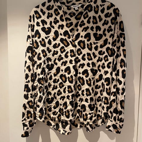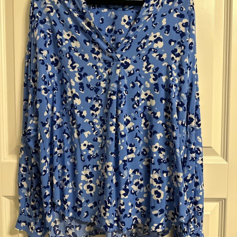 Blusen er hvit med blonder øverst og har lange ermer. Materialet ser ut til å være lett og egnet for daglig bruk.
