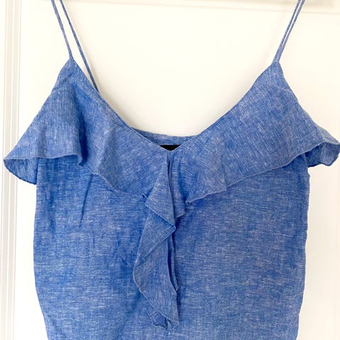 Selger denne toppen siden jeg ikke har klær som kan styles med den, men er nydelig uansett. Utsolgt overalt på nett. Bare prøvd på og aldri brukt, så god som ny og kjøpte for fullpris - 499kr! Vanlig i størrelsen, men har en loose fit sånn at volangene får mer volum - passer både s-m. Kan åpnes og lukkes på siden og oppe ved halsen 😊😊
