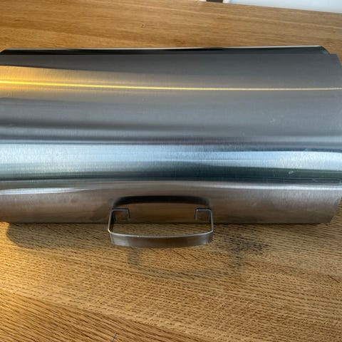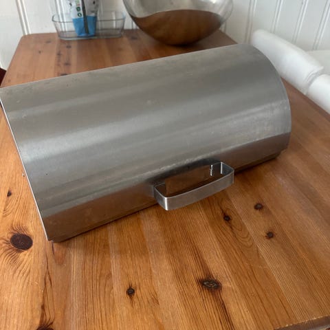 Selger en retro/vintage brødboks i metall, trolig emaljert (porcelain/enamel). Klassisk hvit utførelse med avrundede former og original lukking. Boksen har noe slitasje og små merker i overflaten, som gir den autentisk patina og ekstra sjarm – akkurat slik en ekte vintage brødboks skal være.