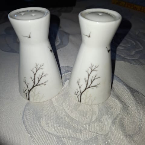 Salt og pepperbøsse i porselen.