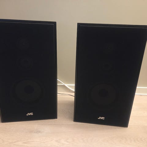 Et par velfungerer 4 tommer VintageJVC LE-01010-012A høyttalerelementer med hvite membraner og metallrammer. Elementene har tilkoblingskabler og er egnet for lydsystemer. Modellnummer LE-01010-012A er merket på baksiden av elementene.