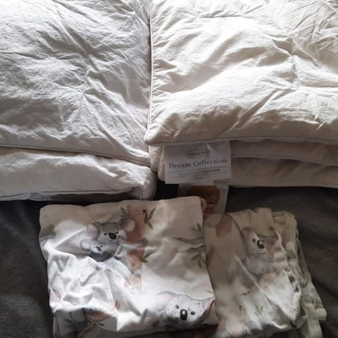 Pent brukt dundyne 100x140 fra Høie , dunpute 40x60 fra Kid og 3 sengesett selges.