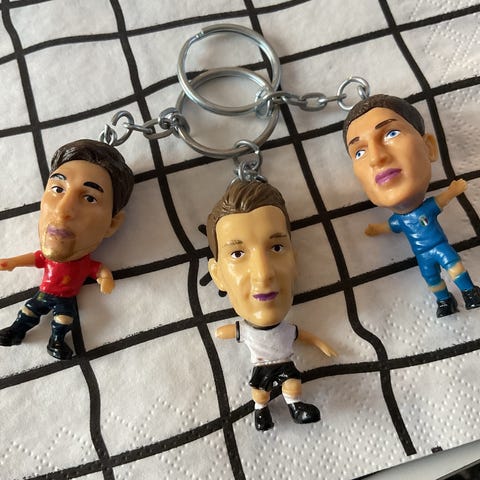 To figurer som forestiller en basketballspiller med basketball og en Liverpool fotballspiller i rød drakt. Begge figurene er laget i plastmateriale og har detaljer som viser ansiktsuttrykk og klær.