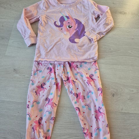 H&M pyjamas i størrelse 98 for jente. Laget av bomull med lilla farge og mønster med enhjørninger og regnbuer.