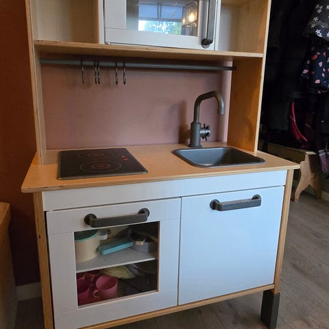 IKEA lekekjøkken for barn i rosa med komfyr, vask, ovn og kjøleskap. Kjøkkenet har detaljer som knapper, håndtak og dekorative hjerter. Egnet for lek og rollelek.