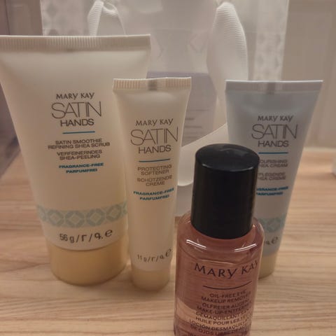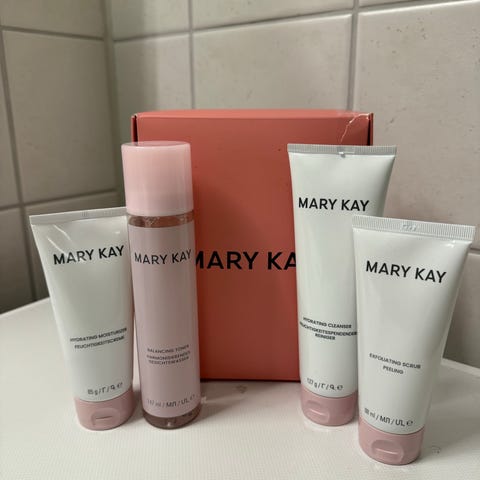Hudpleiesett: nypris 2570,- for 4 produkter. Selges nå for 1599,-. Settet består av rens, fuktmaske, dagkrem og nattkrem. Til tørr/normal hud. Settet er prøvd 1 kveld.