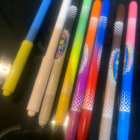 Uåpnet, kneadable erasers, visker (litt som «slim» bare hardere, man kan liksom bevege på den litt som en fidget leke og visk i en.)