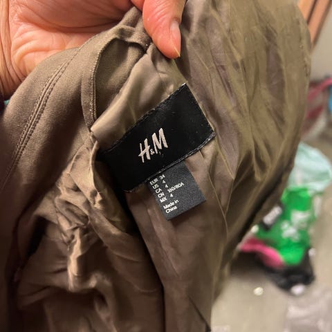 H&M blazer i størrelse 44 for kvinner. Jakken er grå og har knappedetaljer på ermene. Den har en glatt innsidenfôr og en klassisk krage. Jakken har lommer på forsiden og lukkes med en hempe