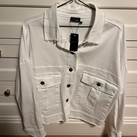 YÖKE Olajakke i blå farge, størrelse M for dame. Jakken er stor i str med knapper som ikke er nikkelbelagt. Jakken har lommer og klassisk denimstil.