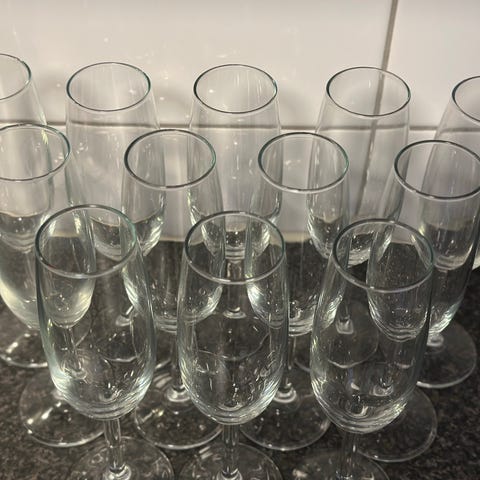 Iittala Champagneglass i klart glass med dekorativt mønster. Glassene har stilk og egner seg til servering av champagne eller musserende vin.