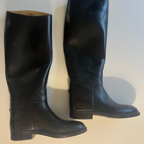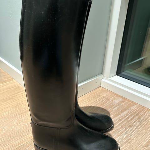 Ridestøvler i størrelse 36 - svart. Støvlene har en glatt overflate og med vanlig ridehæl. Sålen viser noe bruksslitasje. Egnet for daglig bruk i stallen og til ridning