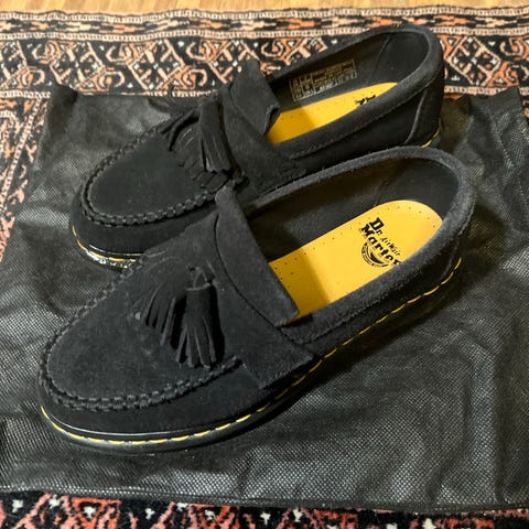 Dr. Martens mokkasiner i størrelse 44 selges. Skoene er laget av svart skinn og har en klassisk design med duskdetaljer.