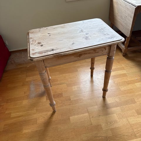Praktisk og pent gammelt bord med sjel selges rimelig. Bordet har vært i familien siden 1904. Overflate: Flammebjørk, lakket. Blir ganske nett og pent når det er slått sammen (da 134 cm), men kan utvides med 2 lemmer (40 cm x2) og blir da enten 174 cm eller ca. 214 cm totalt. Lemmene følger med, men begynner å bli gamle og litt slitt. Bordet selges uten stolene på bildene. Bordet har noen skader (hvite merker) på den ene siden, og selges derfor rimelig.