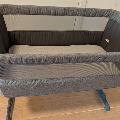 Yngri bedside crib i fargen grå. Pent brukt og hele tiden hatt både laken og skinnfell oppå madrassen. Sengen har flere justerbare høyder.