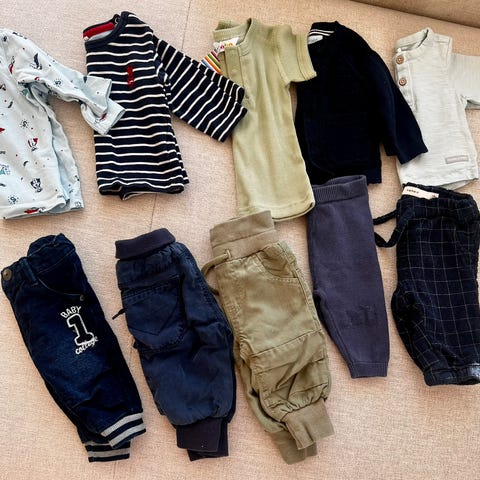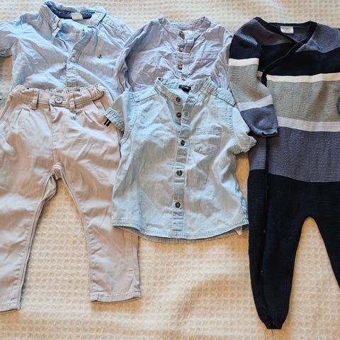 Klærne er pent brukt av ett barn. Oppdaget en liten flekk på den ene skulderen på den beige bodyen når jeg såg nøyere over klærne (ikke veldig synlig, men se bilde). Ellers ingen flekker eller synlig slitasje.