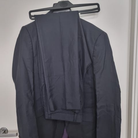 Bertoni dress og skjorte brukt til konfirmant. Bukse str 30/32 (lagt opp 4,5 cm nå). Jakke str 46. Skjorte str 38. Godt stoff med litt stretch som gjør dressen god å bevege seg. Fin smal figur som passe godt til ungdom og ung voksen. Kan prøves før kjøp. Lengde på bukse kan enkelt justeres. Tatt vare på lappene og ekstra knapper til alle delene. Selges til halv pris.