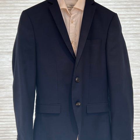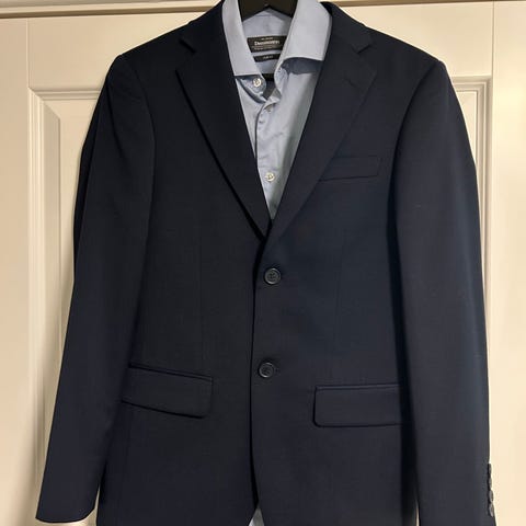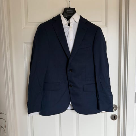 Bertoni dress og skjorte brukt til konfirmant. Bukse str 30/32 (lagt opp 4,5 cm nå). Jakke str 46. Skjorte str 38. Godt stoff med litt stretch som gjør dressen god å bevege seg. Fin modell som passe godt til ungdom og ung voksen. Kan prøves før kjøp. Lengde på bukse kan enkelt justeres. Tatt vare på lappene og ekstra knapper til alle delene. Selges til under halv pris.