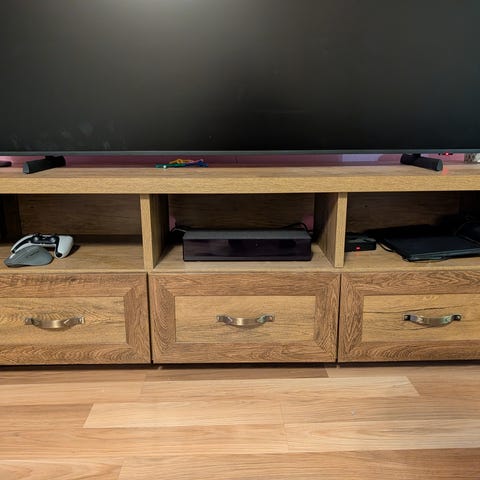 TV-bordet er hjemmesnekret og har funket veldig bra som en dekorativ skjenk under TV-en. Bordet har dessverre ingen skuffer/innebygde hyller.