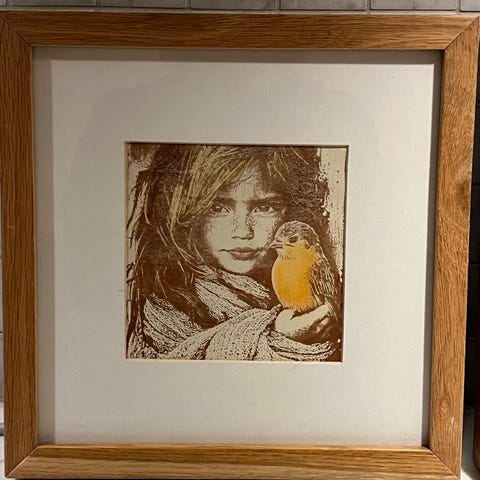 Selger mine nyproduserte grafiske trykk, såkalte monotrykk, laget av akrylmaling på silikonplate. Flere av dem er malt med pastellkritt i detaljer etter tørking. Disse 13 kommer i fin IKEA ramme, med passepartout, de er ca 31 x 21 cm m ramme. Det siste røde av katten er mye større, 30 x 40 cm. Får hvit ramme når jeg får kjøpt en. De koster bare 200 kr stykket innrammet. Det store av katten koster 300 innrammet. Har laget dem slik at mange passer sammen to og to.