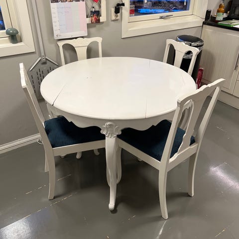 Pent bord med tilhørende stoler. Hentes fra 1 januar! Åpen for bud. Bord og stoler! Diameter: 120cm