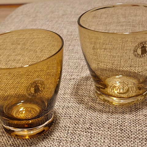 Diameter ved kanten er ca. 8 cm og høyden rundt 10 cm; begge er uten nagg og har normal, lett bruksslitasje i bunnen.