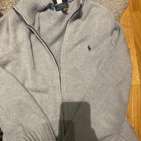 Ralph Lauren Polo genser i hvit farge, størrelse S/M for herre. Laget av bomullsmateriale. Genseren har en glidelås i halsen og ribbestrikkede kanter.