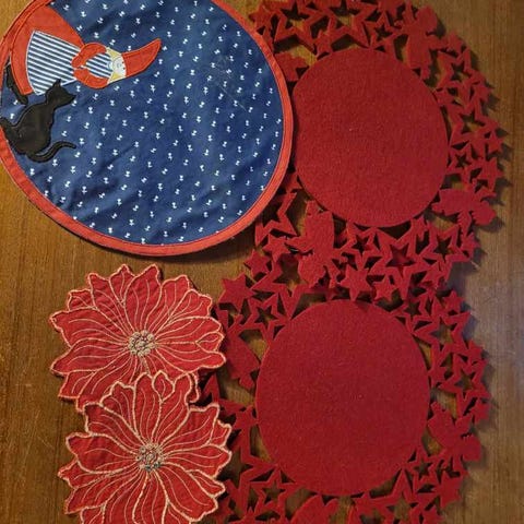 Søkeord julebrikke juleduk julepynt stjerneduk god jul brodert håndarbeid jul lin tekstil retro vintage borddekking rød grønn gul