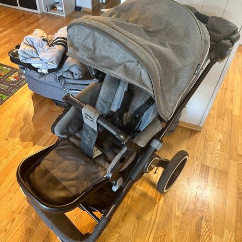 Emmaljunga barnevogn med svart/blå farge, inkludert fotpose. Vognen har justerbart håndtak med brun detalj og fire hjul. Passer for barn og har polstret sete for komfort.Masse ekstrautstyr. Vognen er fra 2020, kjøpt ny hos Babyshop Jessheim. Den er brukt til to barn og er fortsatt hel, pen og svært god å trille. Vognen fremstår som ny . En god pris
