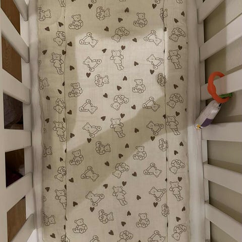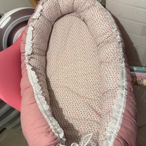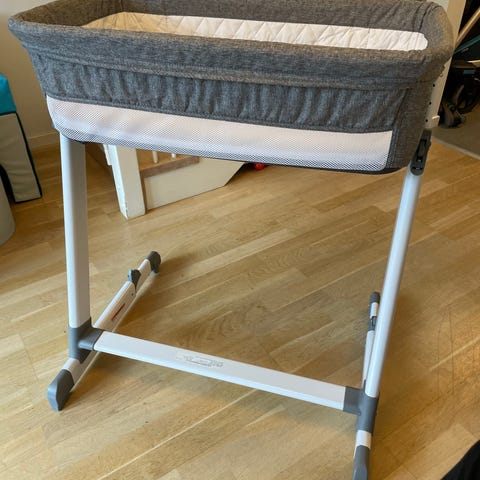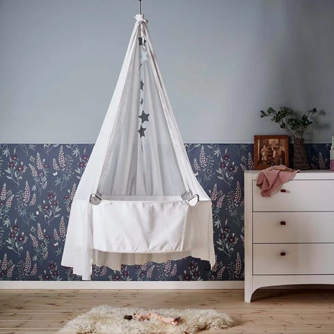 Leander vugge med madrass. Vuggen har en oval form og er laget for barn. Madrassen er hvit med quiltet mønster og pustende materiale, designet for komfort og sikkerhet.