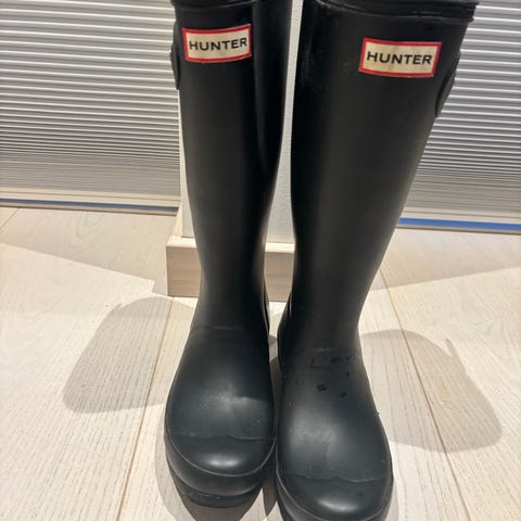 Hunter gummistøvler for jenter i størrelse 36. Støvlene er svarte og laget i gummi, egnet for våte forhold og utendørs bruk.