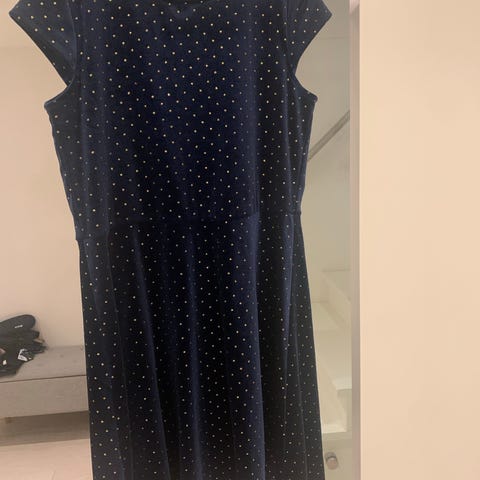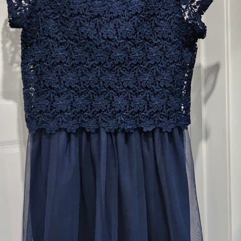 Nydelig mørkeblå finkjole som passer godt som julekjole. Den har korte, puffede ermer og et skjørt med voluminøst tyllstoff.